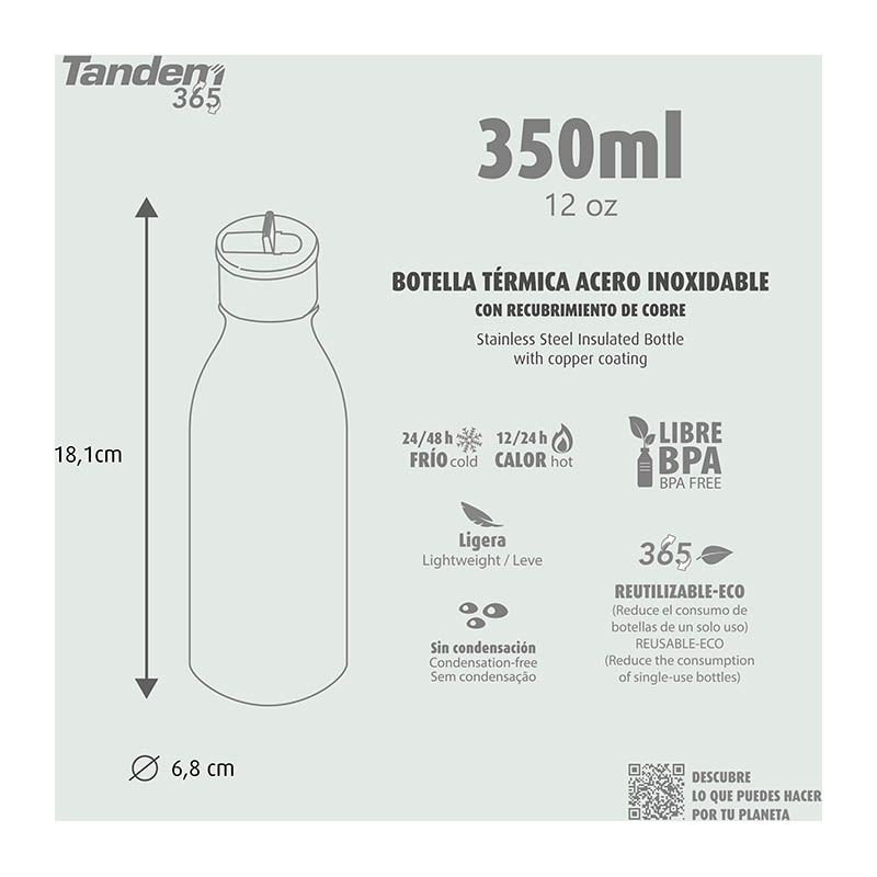 Disfruta de tus bebidas siempre en su punto con esta botella térmica de 350 ml, con unas dimensiones aproximadas de 6,8 x 18 cm. Fabricada en acero inoxidable 304 de grado alimentario 18/8 y completamente libre de BPA, ofrece una combinación equilibrada de ligereza, resistencia y durabilidad. Su sistema de aislamiento al vacío de doble pared, con revestimiento interior de cobre, garantiza una óptima conservación de la temperatura, manteniendo las bebidas frías entre 24 y 48 horas y las calientes de 12 a 24 horas. Incorpora tecnología anticondensación para evitar la humedad exterior y un tapón de rosca antiderrames que asegura un cierre hermético y fiable. Se presenta en una cuidada caja de cartón reutilizable, perfecta para el colegio, el trabajo, la práctica deportiva o los paseos diarios.