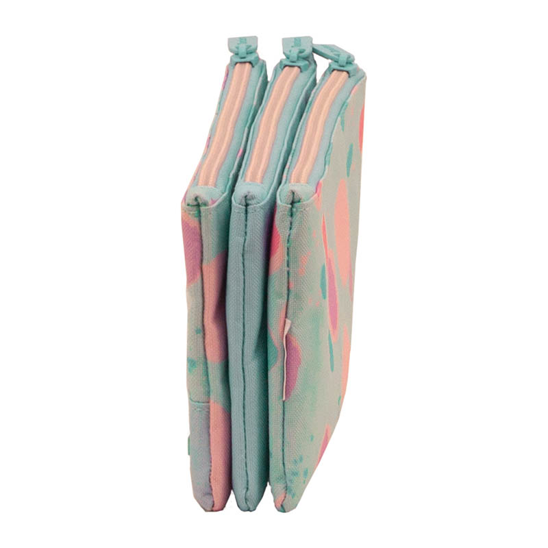 Estuche de triple compartimento con cremalleras independientes. Permite organizar tus accesorios de uso diario con comodidad y un diseño moderno, perfecto para el colegio o el hogar.