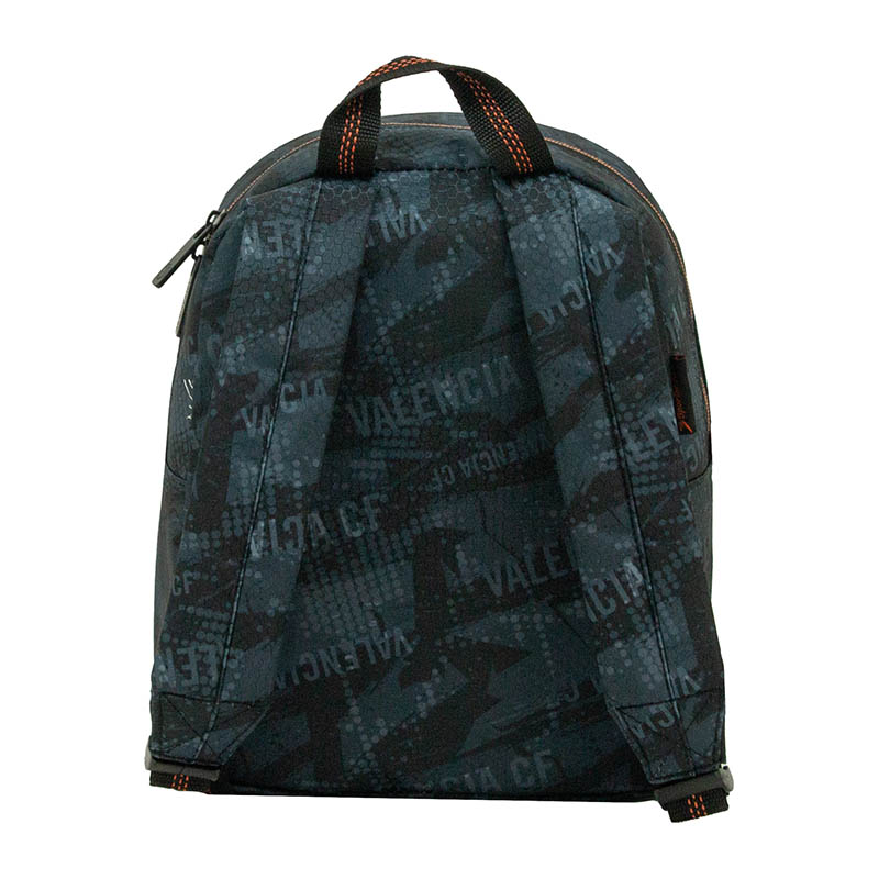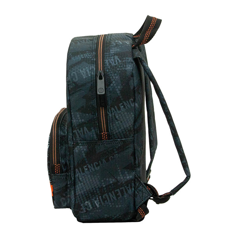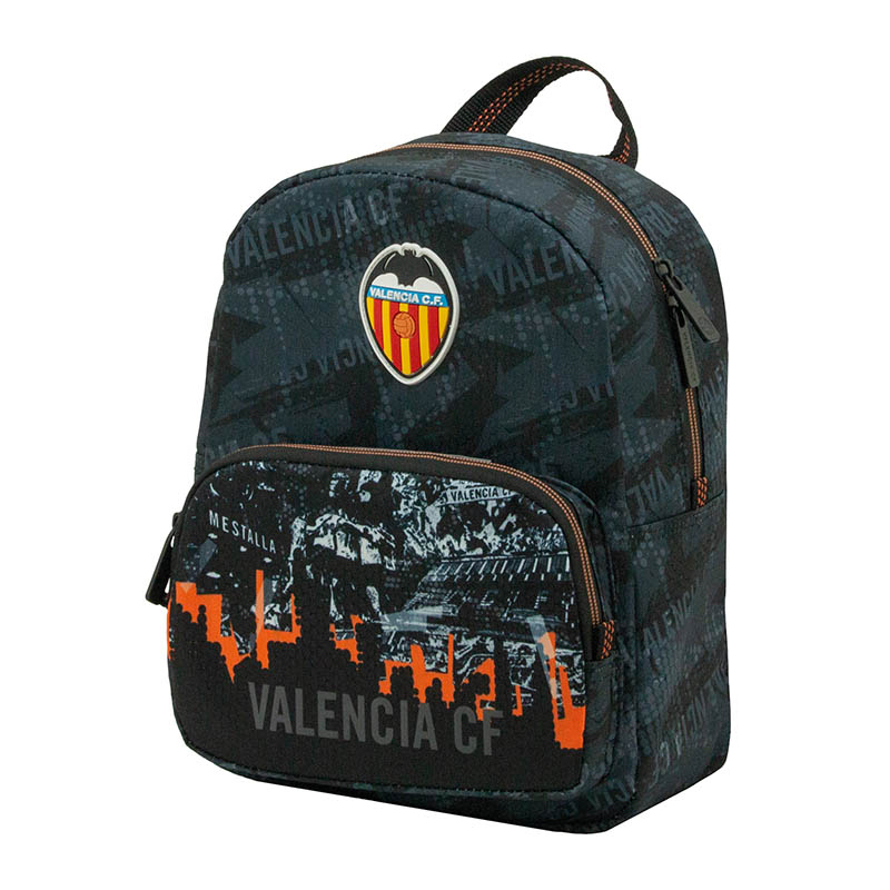 Mochila infantil inspirada en el Valencia C.F., compacta, ligera y resistente, ideal para colegio o guardería. Incluye bolsillo frontal con cremallera, tirantes ajustables y asa superior para un uso cómodo diario.