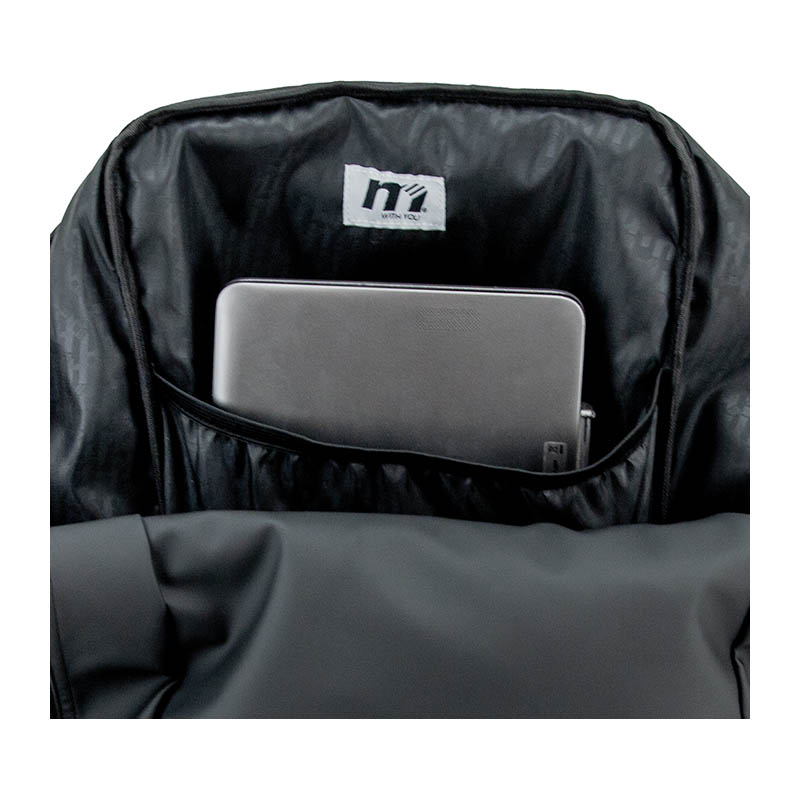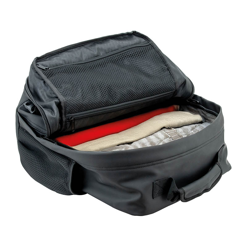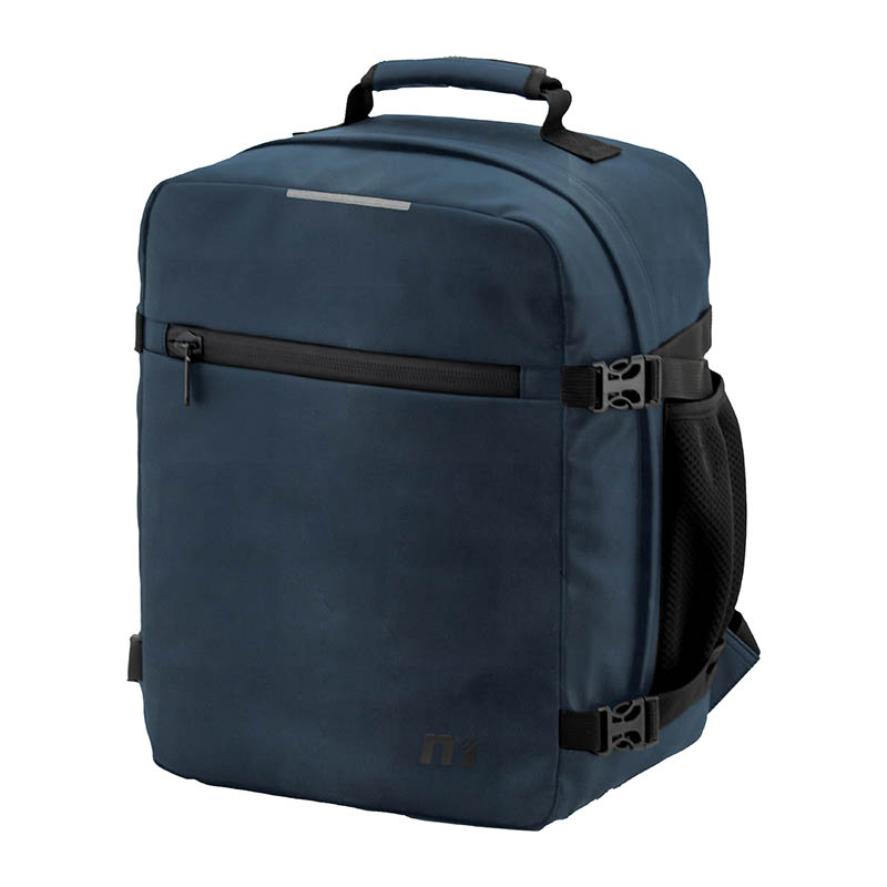 Con 24 litros de capacidad, dispone de espacio para ropa, calzado y objetos esenciales. Incluye un compartimento principal con funda para portátil o tablet, dos bolsillos interiores con cremallera, un bolsillo frontal amplio de acceso rápido para móvil, gafas o documentos y un bolsillo lateral para botella. Incorpora doble asa —superior y lateral—, además de cuatro correas laterales con cierre de clip que refuerzan la sujeción del contenido. También es adaptable a carro o trolley.