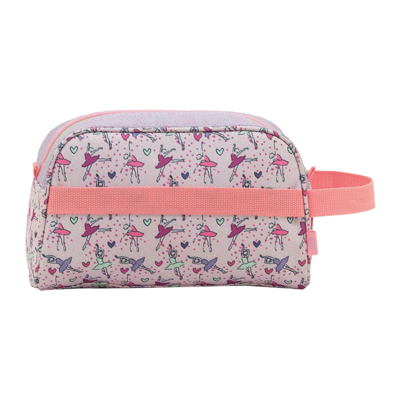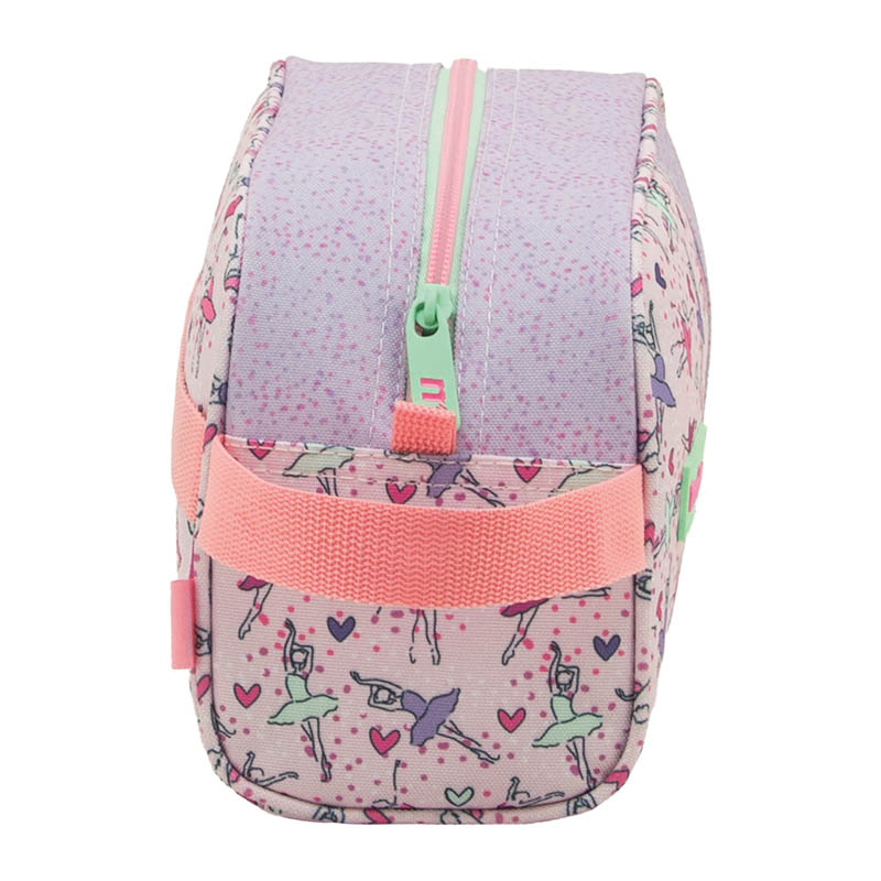 Neceser escolar práctico y resistente, con compartimento isotermo, asa lateral y banda trasera para fijarlo al carro. Cierre con cremallera seguro durante todo el día.