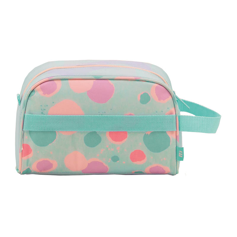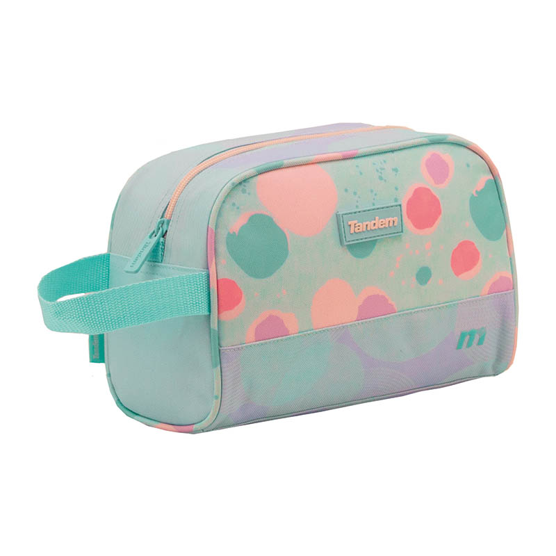 Neceser escolar funcional y resistente, con compartimento isotermo, asa lateral y banda trasera para fijarlo al carro. Cierre con cremallera seguro durante toda la jornada.